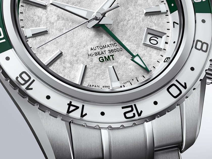 Imagine a valley where the highest peaks are capped with snow, even in summer. Such a snowy valley enchants the hearts of those who happen to glimpse its rare scenery. In the SBGJ277, the green of the rotating bezel contrasts with the pure white of the finely molded dial pattern, evoking this special mountain scene. One characteristic of this model is its prominent rotating bezel, which imparts a sporty character and allows wearers the ability to check the time in up to three different time zones. The watch houses the mechanical Hi-Beat 36000 GMT Caliber 9S86, which runs at ten beats per second while offering excellent rate stability and resistance to outside interference.